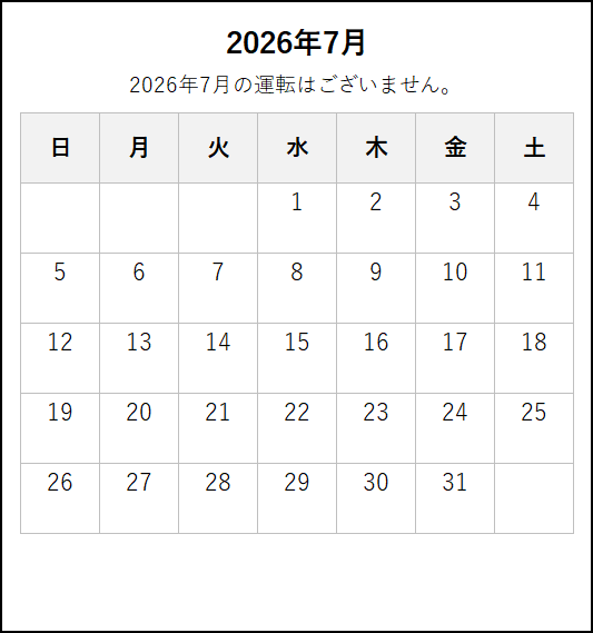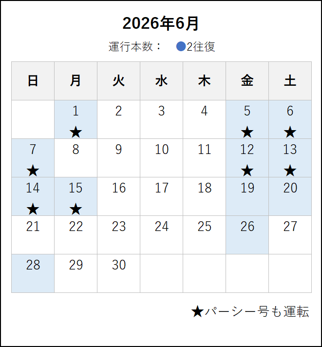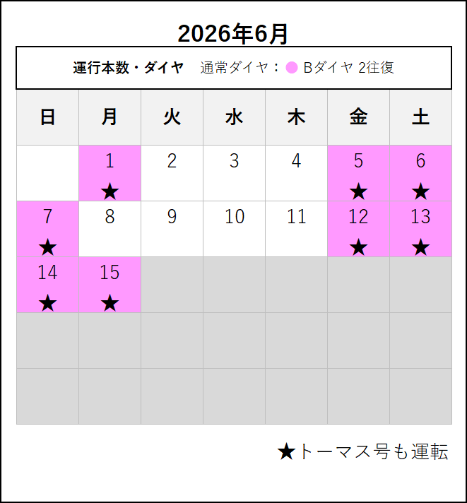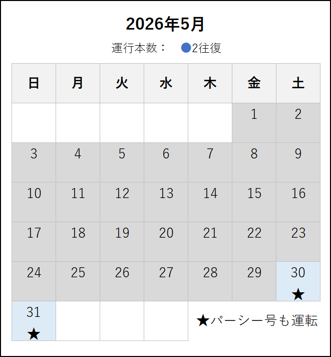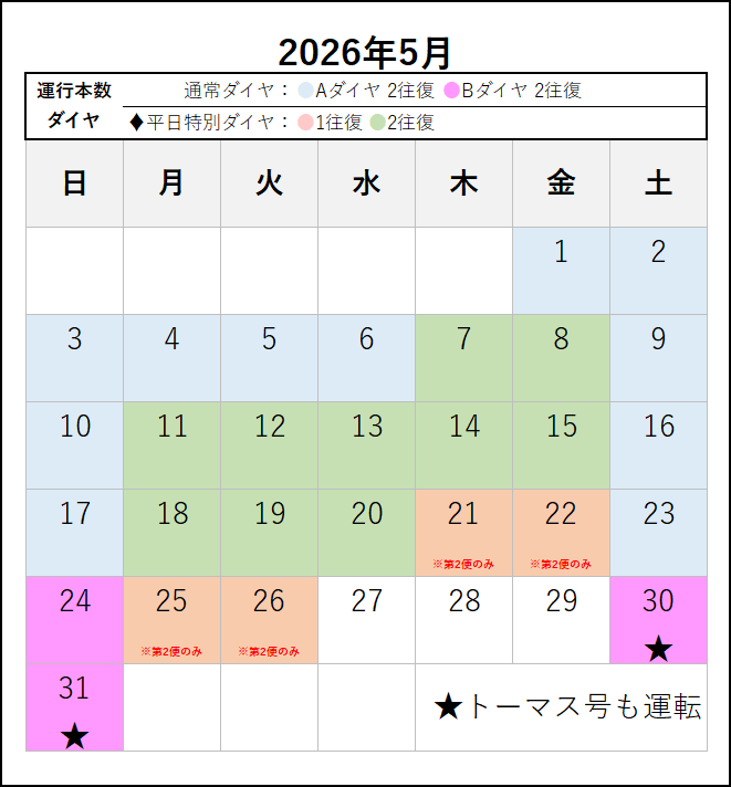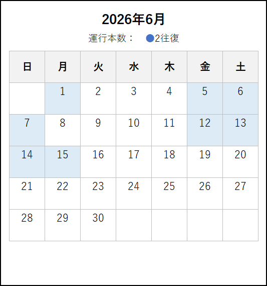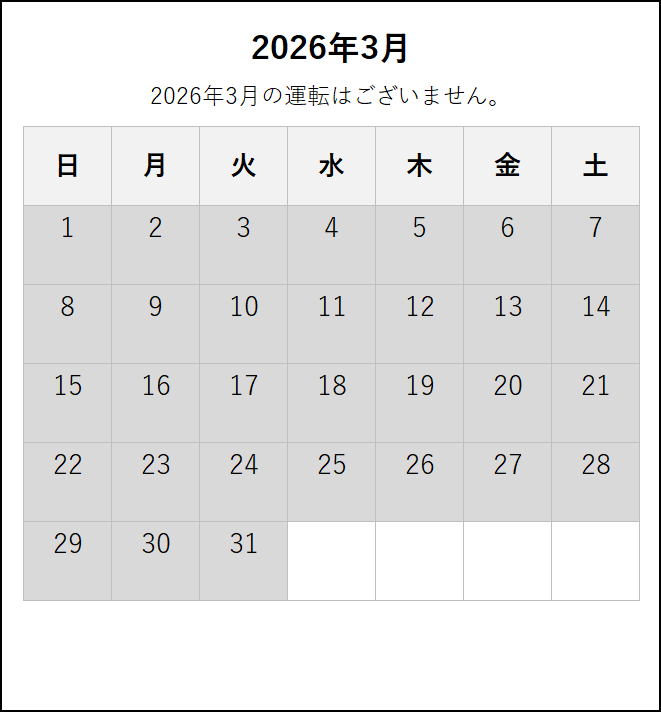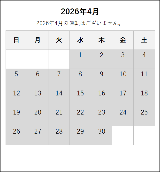 ※ 4月6日にダイヤ改正を行います。4月6日以降の運転日・運転時刻は、この下の「2026年4月6日~6月」のタブをご覧ください。