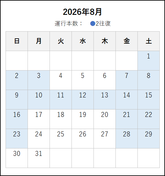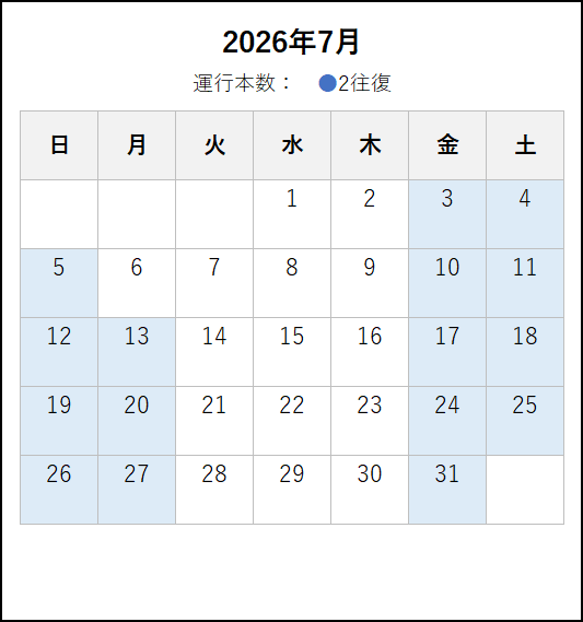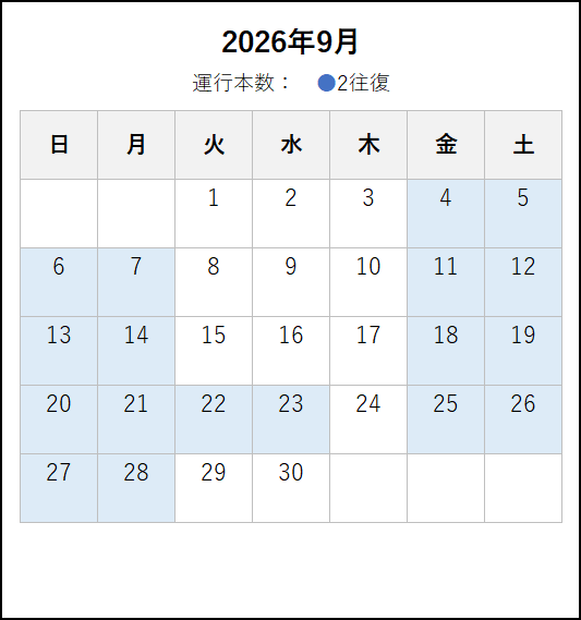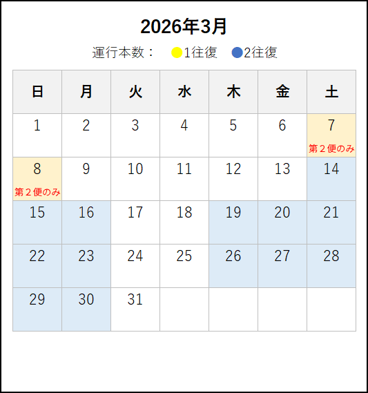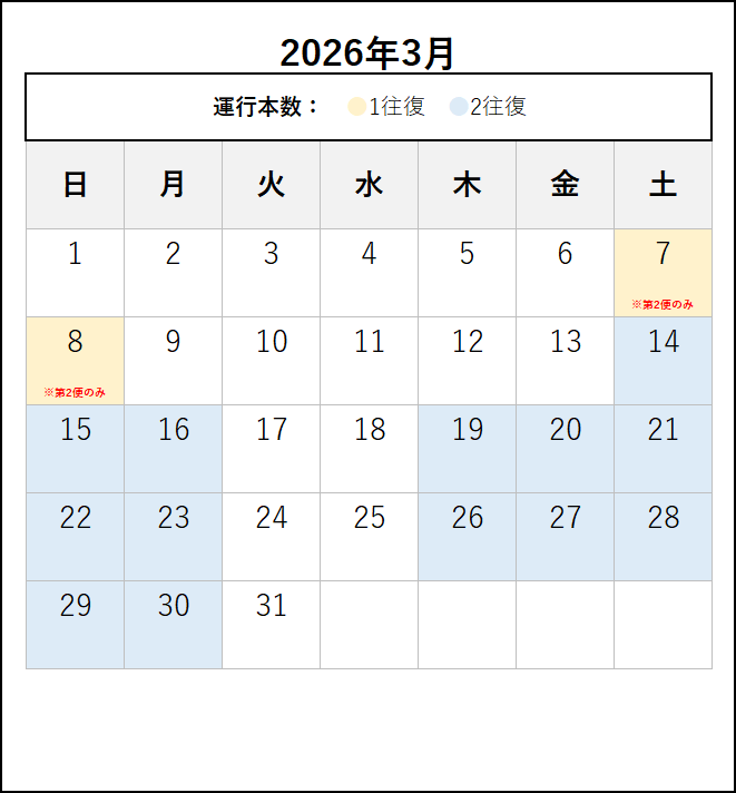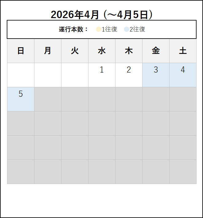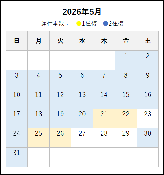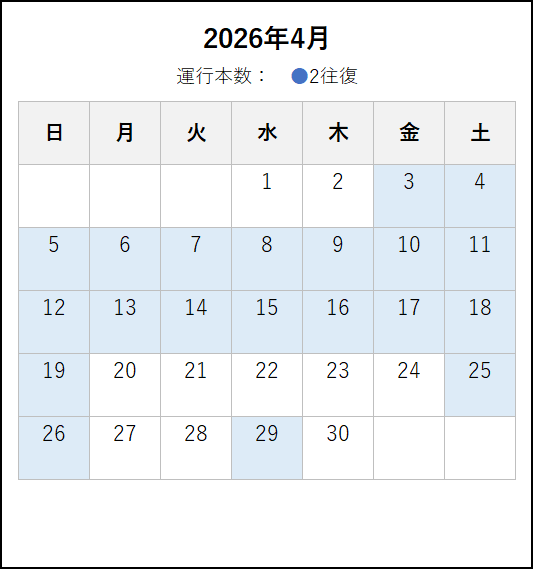 ※ 2026年4月6日以降の運転時刻です。4月5日までの運転日・運転時刻は、この上の「~2026年4月5日まで」のタブをご覧ください。